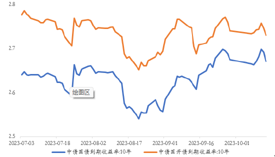 债市上周前四天震荡调整,周五在不及预期的数据和特别国债落空的消息影响下反弹。全周来看,10年期国债收益率从9月28日的2.6751%下行0.49bp至2.6702%;10年期国开债收益率从9月28日的2.74%下行0.98bp至2.7302%;国债期货T主力合约收盘价从101.785元下跌0.125元至周五101.66元。