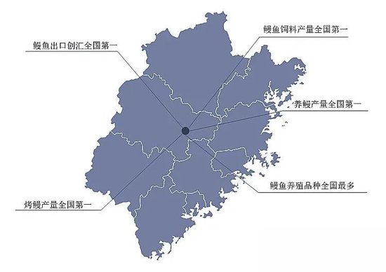 其中,福建省是中国最大的鳗鱼产地,占全国总产量的60%以上,养殖品种数量、养鳗产量、烤鳗产量、鳗鱼饲料产量、鳗鱼出口创汇均居全国第一。福建省有着得天独厚的自然条件和人文环境,适合养殖鳗鱼。此外优质的淡水资源和温暖湿润的气候,也有利于鳗鱼生长发育。福建省还有着悠久的养殖历史和传统技艺,有着专业的养殖人才和管理团队。
