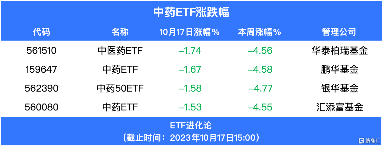 中药股下跌,片仔癀跌超5%,华泰柏瑞基金中医药ETF、鹏华基金中药ETF、银华基金中药50ETF 、汇添富基金 中药ETF跌超1.5%,本周跌超4.5%。