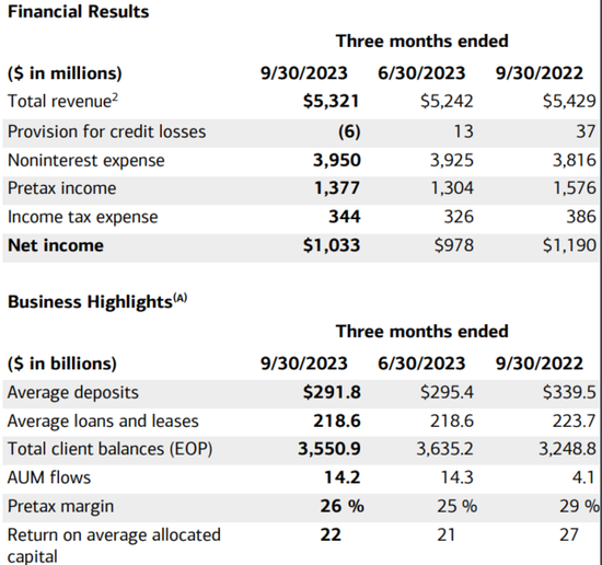 美银三季度全球财富与投资管理业务营收为53.2亿美元,同比下滑2%,净利润10.3亿美元,同比下滑13.4%。