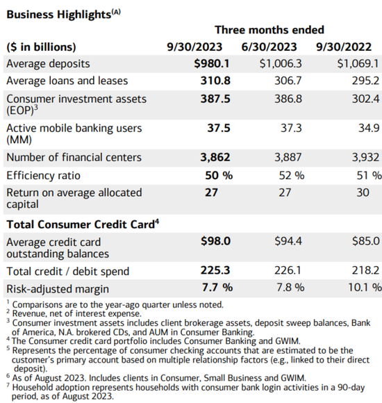其中,消费者银行业务营收104.72亿美元,净利润28.64亿美元,同比下滑7%。同时消费者存款下降了8%至9800亿美元。