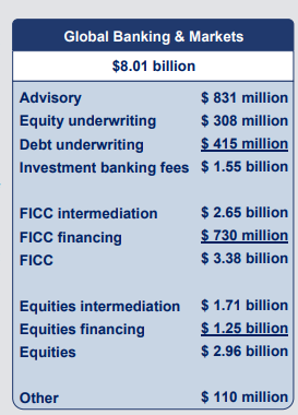 其中,投资银行费用为15.5亿美元,同比基本持平去年,原因是债务承销净收入增加(主要受杠杆融资活动推动),股票承销净收入增加(主要来自首次公开发行),但被咨询业务净收入减少(反映已完成的并购交易减少)所抵消。