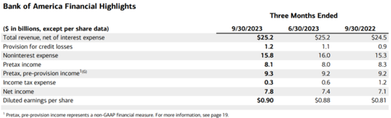 财报显示,美国银行第三季度实现营业收入252亿美元,环比持平,同比增长2.8%;净利润78亿美元,环比增长5.4%,同比增长9.8%。