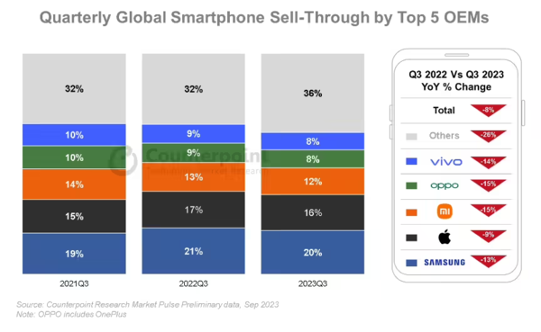 【手机中国新闻】10月17日,手机中国了解到,市场研究机构Counterpoint Research发布了三季度全球智能手机市场报告,报告显示今年第三季度全球智能手机市场整体销量同比下滑8%环比增长2%,连续第九个季度出现下降,该季度为十年来最差表现。