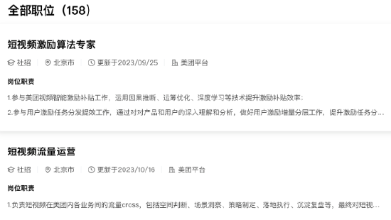截至10月17日,美团招聘官网上挂出158个短视频业务相关岗位需求,包括了算法专家、流量运营、客户端开发、策略运营和数据分析等不同方向,基本覆盖短视频赛道全链路。在4月份,相关的职位招聘数量还仅有40多个。