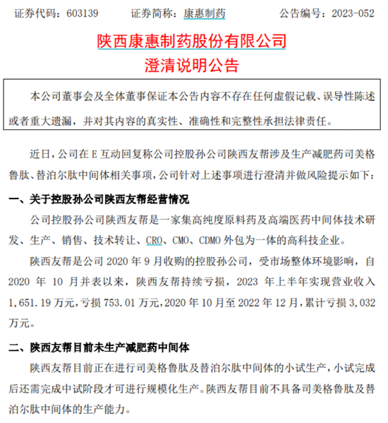 康惠制药方面,据了解,10月13日,康惠制药在上海证券交易所“e互动”平台回复投资者关于孙公司陕西友帮生产线投产情况及主要生产哪类药物的原料药及中间体问题时,称“陕西友帮可生产降糖/减肥药物司美格鲁肽、替泊尔肽中间体”。