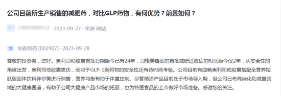 其中,在今年9月15日,公司在e互动回复投资者关于公司是否有利拉鲁肽注射液和司美格鲁肽注射液等相关产品和服务时称,“公司全资子公司华威医药可以为客户提供利拉鲁肽注射液及司美格鲁肽注射液的相关药品研发服务”。