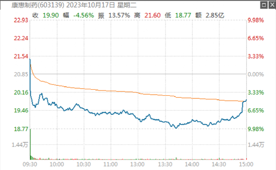 出尔反尔的表述,导致康惠制药股价上蹿下跳。10月16日一早,康惠制药涨停开盘,大量买单蜂拥涨停板,最终收出“一字板”。17日,公司股价大幅高开,随后放量下跌,盘中巨震。