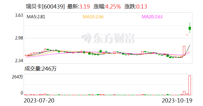 继10月17日、18日收获两连板后,10月19日早间该公司股价再度开盘涨停,报3.37元/股,刷新2021年6月以来高点。不过开盘后不久,瑞贝卡就打开涨停板,截至上午收盘报涨3.27%。
