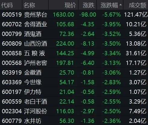 白酒板块领跌两市,龙头贵州茅台大跌5.67%。