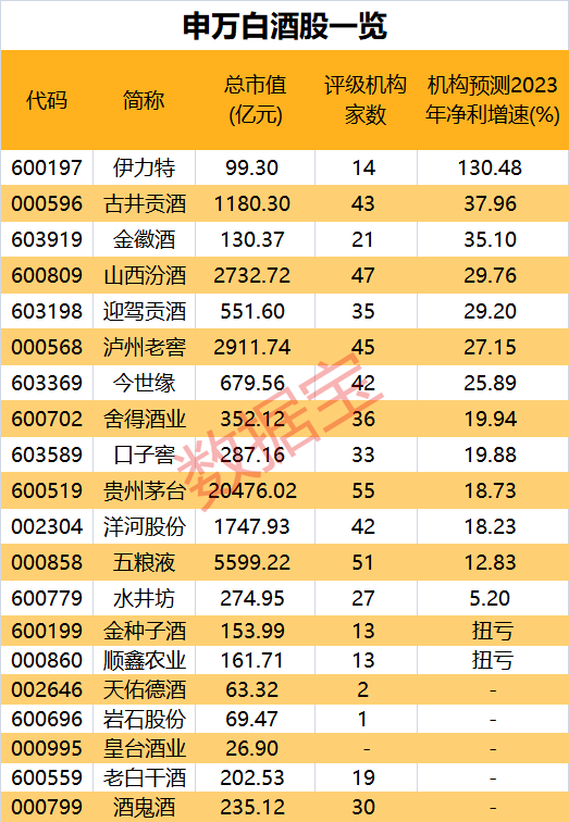 证券时报·数据宝统计,根据10家及以上机构一致预测,2023年白酒股业绩有望稳定增长,预计12股净利增速有望超10%。其中,贵州茅台、五粮液等市值巨头2023年净利增速分别有望达到18.73%、12.83%;泸州老窖、山西汾酒等净利增速均有望超过25%。