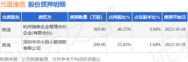 证券之星消息,元道通信(301139)10月19日公开信息显示,股东燕鸿向杭州瑞曲企业管理合伙企业(有限合伙)、深圳市中小担小额贷款有限公司合计质押569.0万股,占总股本4.68%。质押详情见下表: