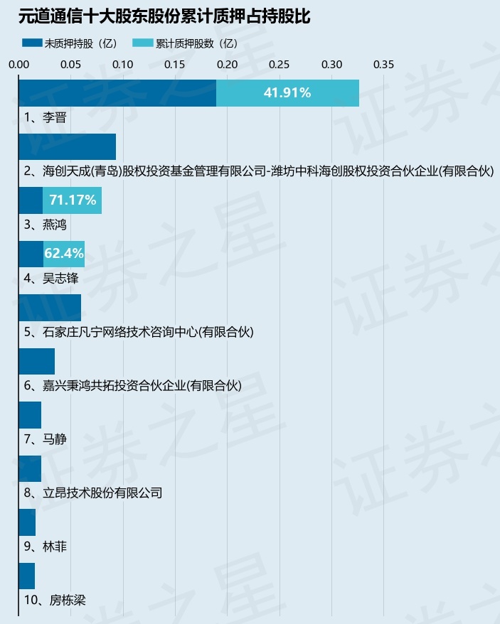 截止本公告日,股东李晋已累计质押股份1368.0万股,占其持股总数的41.91%,股东燕鸿已累计质押股份569.0万股,占其持股总数的71.17%,股东吴志锋已累计质押股份393.1万股,占其持股总数的62.4%。本次质押后元道通信十大股东的累计质押股份占持股比例见下图: