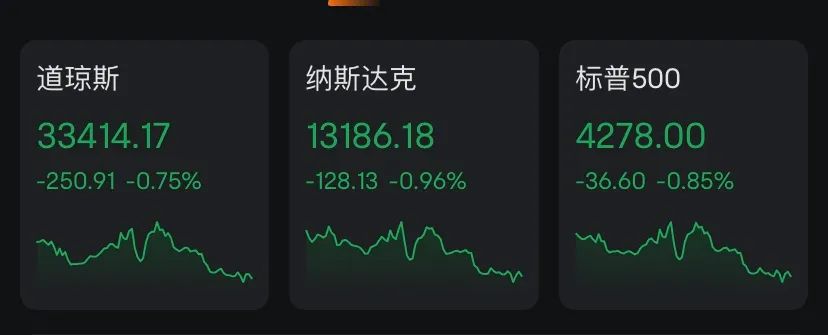 作为“全球资产价格之锚”的十年期美债再创新高对风险资产形成了显著压制。当地时间周四(10月19日),美国三大股指全线收跌。截至收盘,道指跌0.75%报33414.17点,标普500指数跌0.85%报4278点,纳指跌0.96%报13186.18点。