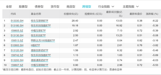 二、 从区域分布来看,同样是科技指数,港股跨境型ETF份额增长要比A股更明显。本周ETF份额增加最多的是恒生互联网科技业和恒生科技,分别有2只和10只基金跟踪,累计份额增加了28.55亿份和24.52亿份。