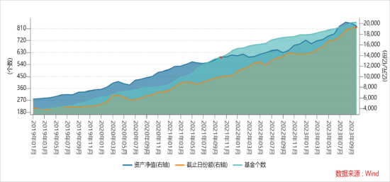 回顾过去几年,偏股型(股票型基金+混合型基金)基金规模和份额持续增长,两者几乎同步,直到2022年才出现分化,净值规模随市场表现波动,但份额相对变动较小。ETF基金也呈现类似的情况,不同的是今年偏股型基金份额增长乏力,而ETF基金份额增长依旧,甚至开始出现与资产净值方向相反的逆市增长。