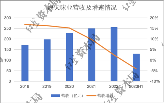 财报显示,2021年-2022年海天味业实现营收分别为250.0亿元、256.1亿元,同比增速9.7%、2.4%,营收增速已经开始明显放缓,这也是上市以来海天味业营收增速首次降至个位数区间。