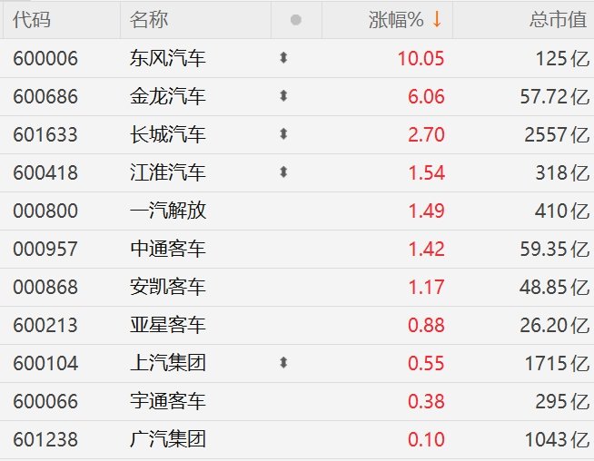 东风汽车直线涨停,金龙汽车冲高超6%,亚星客车、中通客车、安凯客车等跟涨。消息面上,工信部表示,将持续扩大国内市场规模,加快制定调整减免车辆购置税新能源汽车产品技术要求,启动公共领域车辆全面电动化先行区试点、智能网联汽车准入和上路通行试点,深入开展新能源汽车下乡活动,持续做大国内市场基本盘。