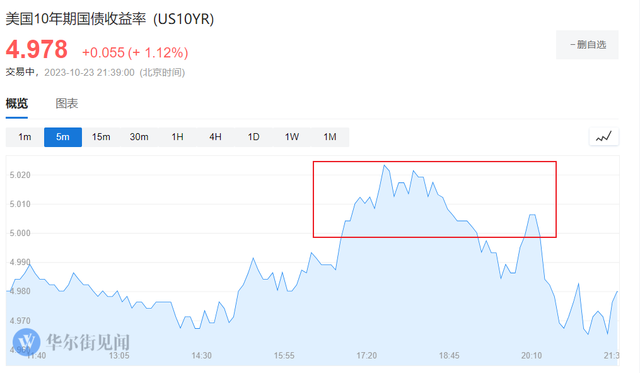 周一,美债风暴持续,10年期美债收益率再度突破5%,创2007年以来的最高水平。