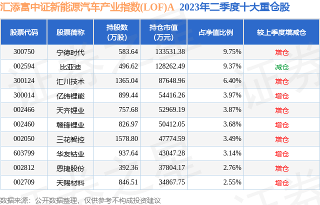 汇添富中证新能源汽车产业指数(LOF)A的前十大重仓股如下: