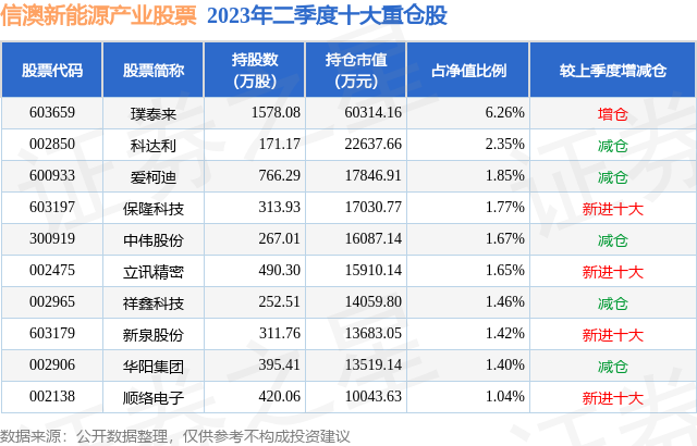 根据2023基金半年报公募基金重仓股数据,重仓该股的公募基金共25家,其中持有数量最多的公募基金为信澳新能源产业股票。信澳新能源产业股票目前规模为96.39亿元,最新净值3.242(10月20日),较上一交易日下跌1.73%,近一年下跌20.13%。该公募基金现任基金经理为冯明远。冯明远在任的基金产品包括:信澳科技创新一年定开混合A,管理时间为2020年5月29日至今,期间收益率为0.4%;信澳研究优选混合A,管理时间为2020年6月22日至今,期间收益率为-1.93%;信澳星奕混合A,管理时间为2021年1月22日至今,期间收益率为-7.94%。