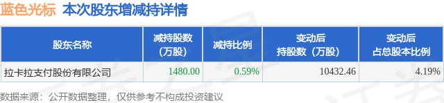 证券之星消息,10月23日蓝色光标发布公告《蓝色光标:关于公司原持股5%以上股东权益变动计划期限届满的公告》,其股东拉卡拉支付股份有限公司于2023年4月25日至2023年10月23日间合计减持1480.0万股,占公司目前总股本的0.595%,变动期间该股股价下跌38.38%,截止10月23日收盘报6.76元。