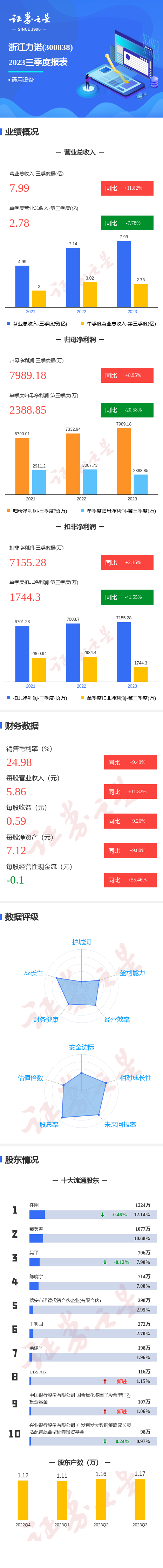 证券之星消息,浙江力诺2023年三季报显示,公司主营收入7.99亿元,同比上升11.82%;归母净利润7989.19万元,同比上升8.95%;扣非净利润7155.28万元,同比上升2.16%;其中2023年第三季度,公司单季度主营收入2.79亿元,同比下降7.78%;单季度归母净利润2388.85万元,同比下降20.58%;单季度扣非净利润1744.31万元,同比下降41.55%;负债率33.35%,投资收益-29.7万元,财务费用-111.69万元,毛利率24.98%。