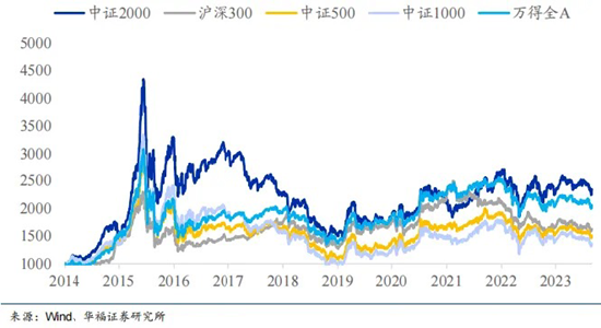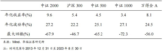 根据华福证券的统计,自2013年12月31日基日以来到2023年8月30日,中证2000指数的累计年化收益是9.6%,这个数字不仅高于同期的另外三个中证系宽基指数(沪深300、中证500和中证1000),甚至比万得全A还要高,这一点十分难得。