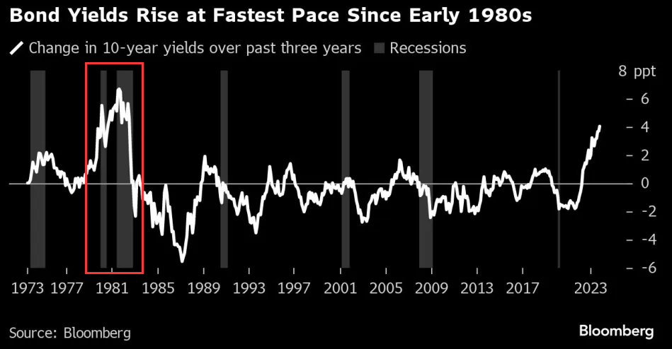 衡量整个金融体系资金成本的关键基准——美国10年期国债收益率在过去三年中已跃升了超过整整4个百分点,这是该收益率自1980年代初期飙升以来的最大涨幅。当时时任美联储主席的沃尔克正努力试图抑制通胀,将10年期美债收益率推高至了近16%。