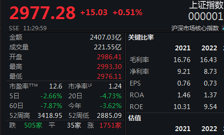 今日,在基建的带动下,沪深股指双双大涨,截至上午收盘,上证指数午盘涨0.51%报2977.28点,深证成指涨0.61%报9541.28点,创业板指跌0.54%报1870.71点,科创50指数涨0.01%报850.73点,市场成交额5748.4亿元,北向资金实际净买入1.1亿元。
