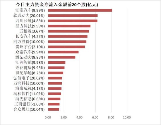4、江淮汽车主力资金净流入8.09亿元居首