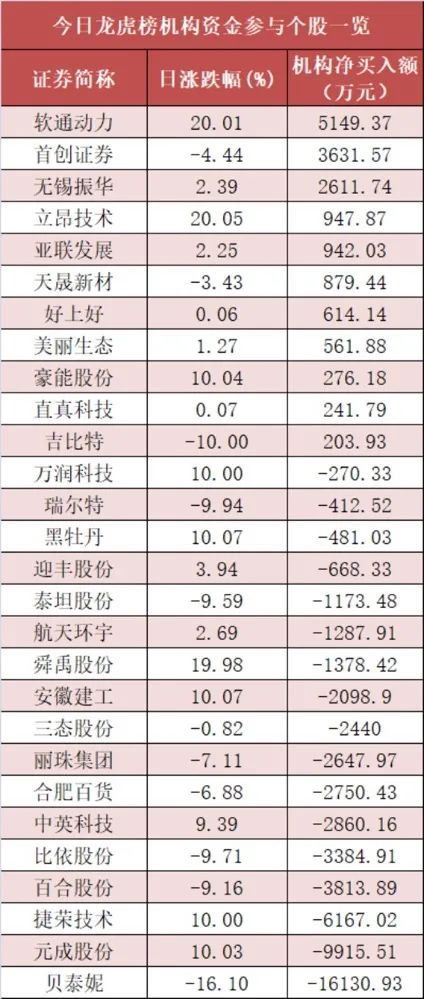盘后龙虎榜数据显示,机构现身28股,其中软通动力等11股呈现机构资金净买入,贝泰妮等17股呈现机构资金净卖出。