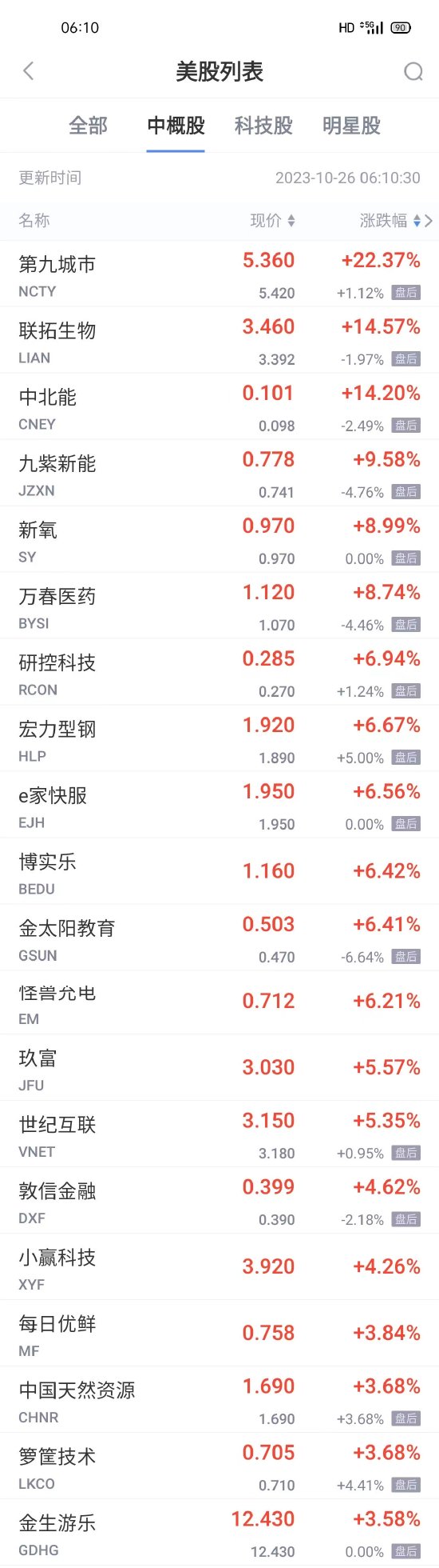 联拓生物涨超14%,怪兽充电涨超6%,世纪互联涨超5%,小赢科技涨超4%,新东方、格林酒店涨超2%,盛丰物流、斗鱼涨超1%。
