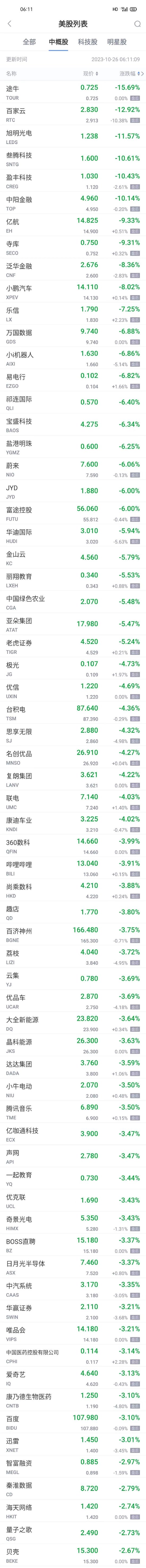 途牛跌超15%,百家云跌超12%,中阳金融跌超10%,亿航跌超9%,小鹏跌超8%,乐信跌超7%,万国数据小i机器人、蔚来跌超6%,金山云、亚朵集团、老虎证券跌超5%,台积电、复朗集团、联电跌超4%,360数科、哔哩哔哩、百济神州、优品车、大全新能源、达达集团、小牛电动、腾讯音乐、亿咖通科技、BOSS直聘、唯品会、爱奇艺、百度、迅雷跌超3%,秦淮数据、量子之歌、贝壳、阿特斯、能链智电、联想汽车、雾芯科技、欢聚集团、阿里巴巴、叮咚买菜、车车科技、大健云仓跌超2%,网易有道、涂鸦智能、华住酒店、禾赛科技、满帮、挚文集团、虎牙、网易跌超1%,汽车之家跌近1%。