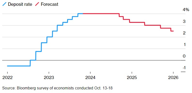 彭博经济资深欧元区经济学家David Powell表示,欧洲央行10月25-26日的会议几乎肯定会导致管理委员会将存款利率维持在4%不变。此外,该央行可能会试图传达其主要政策利率将在明年上半年保持不变的信息。