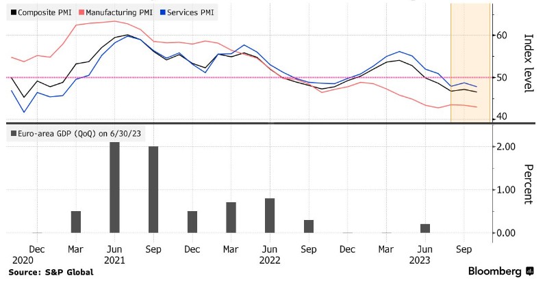 标普全球的数据显示,这些趋势正在加剧欧元区陷入衰退的风险。该公司的采购经理人指数(PMI)显示,本季度私营部门制造业和服务业双双进一步收缩。