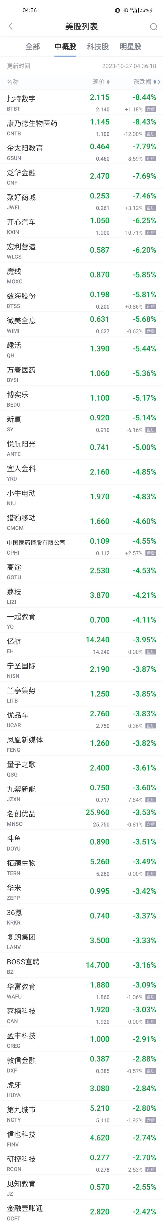 领跌中概股列表: