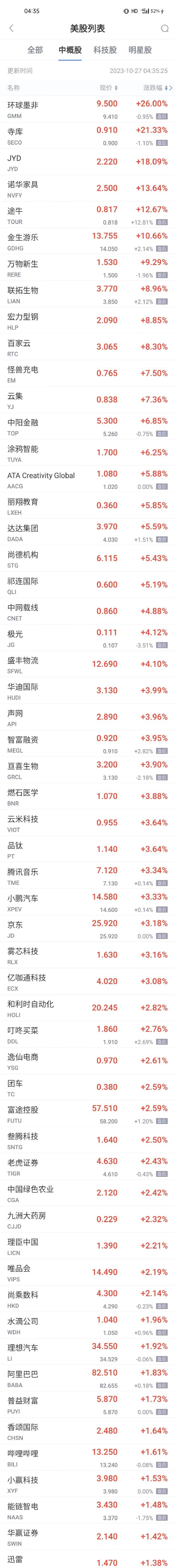环球墨非涨超26%,途牛涨超12%,万物新生涨超9%,联拓生物、百家云涨超8%,怪兽充电涨超7%,中阳金融、涂鸦智能涨超6%,达达集团涨超5%,盛丰物流涨超4%,亘喜生物、腾讯音乐、小鹏汽车、京东、雾芯科技、亿咖通科技涨超3%,叮咚买菜、逸仙电商、富途控股、老虎证券、唯品会、尚乘数科涨超2%,水滴公司、理想汽车、阿里巴巴、哔哩哔哩、小赢科技、能链智电、迅雷、新东方、携程、小i机器人、大健云仓、洪恩、诺亚财富、360数科、爱奇艺涨超1%,华住酒店、车车科技涨近1%。