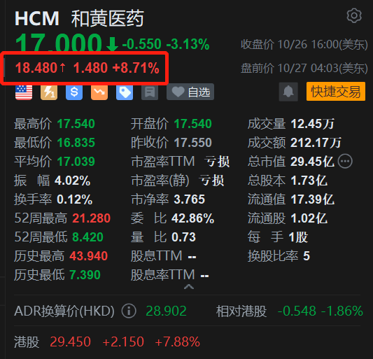 和黄医药(HCM.US)盘前涨8.71%报18.84美元。公司专注于肿瘤和免疫系统疾病创新药的研发,现有13款处于临床阶段的创新药物,正在开展逾15项注册研究,其中呋喹替尼、索凡替尼、赛沃替尼已在国内获批上市。其中,公司重磅新药呋喹替尼结直肠癌三线治疗优势明显,海外获批在即。