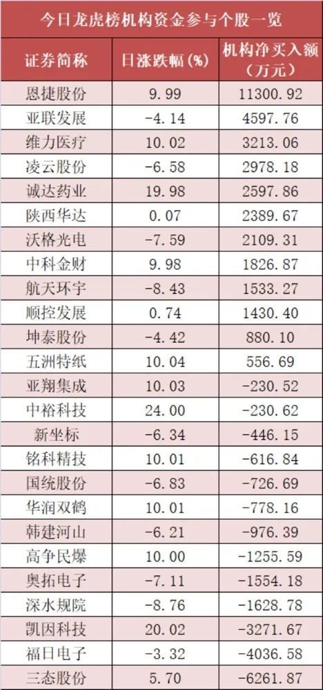 盘后龙虎榜数据显示,机构现身25股,其中恩捷股份等12股现机构资金净买入,三态股份等13股呈现机构资金净卖出。