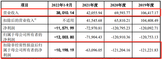 2019-2022年1-9月,新锦动力的营业收入分别为106,417.17万元、69,593.77万元、42,055.94万元、38,010.14万元;扣除非经常性损益后归属于母公司所有者的净利润分别为-121,221.83万元、-121,204.16万元、-63,096.05万元、-10,198.19万元。