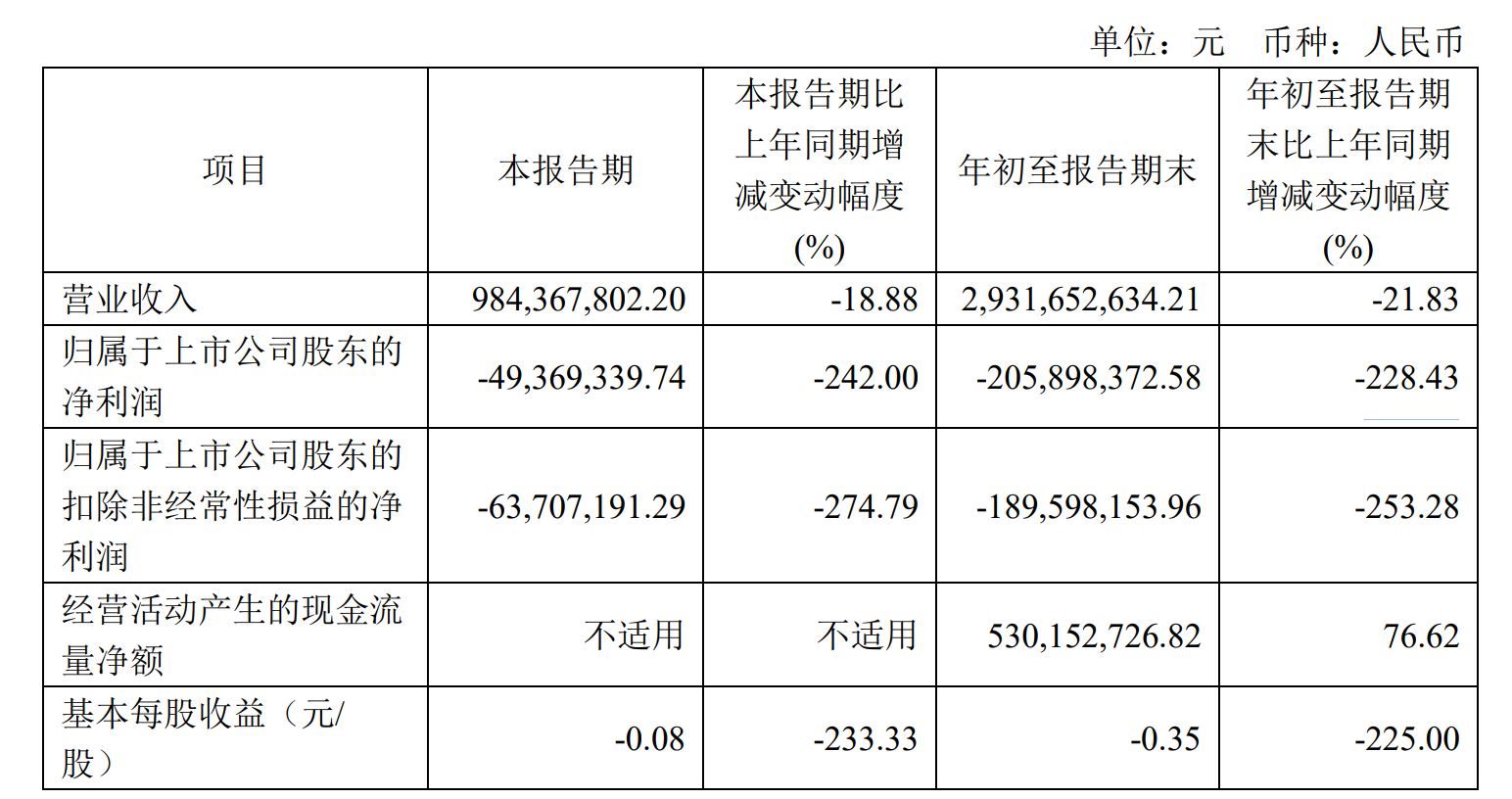 根据公告,2023年第三季度,公司实现营收9.84亿元,同比降18.88%;实现归属于上市公司股东的净利润-4936.93万元,同比降242%。