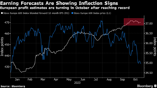 “欧盟股市投资者仍普遍悲观,主要受到令人失望的财报季和持续的地缘政治担忧的拖累,”ActivTrades的技术分析师Pierre Veyret表示,“即使2023年下半年股价变得更有吸引力,但不确定的环境仍让投资者难以找到充分的理由买入。”