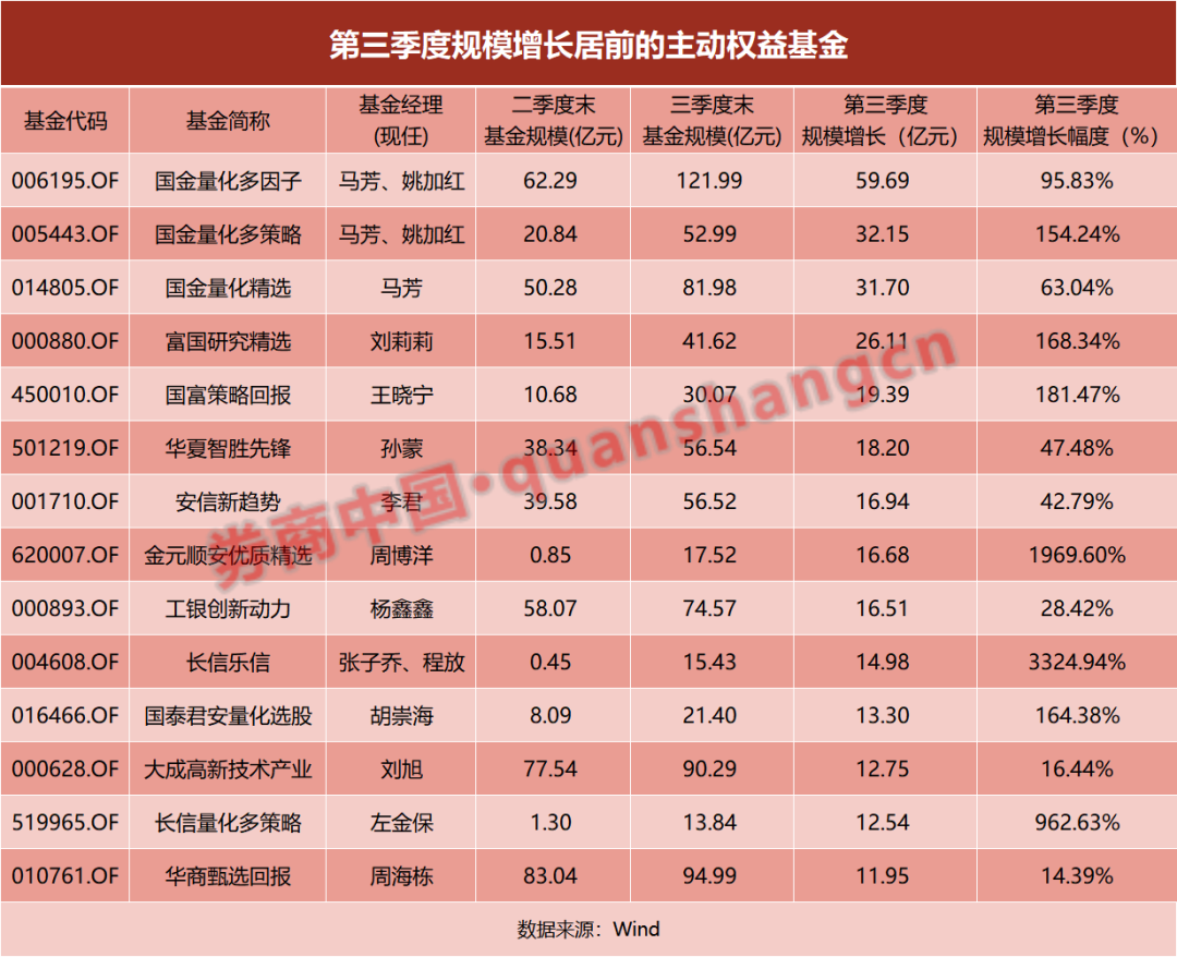 据Wind数据统计,共有14只基金在三季度,规模增长超10亿元。其中国金量化多因子、国金量化多策略、国金量化精选规模分别增长59.69亿元、32.15亿元、31.7亿元。值得一提的是,这三只均为公募量化产品,成为吸金“利器”。