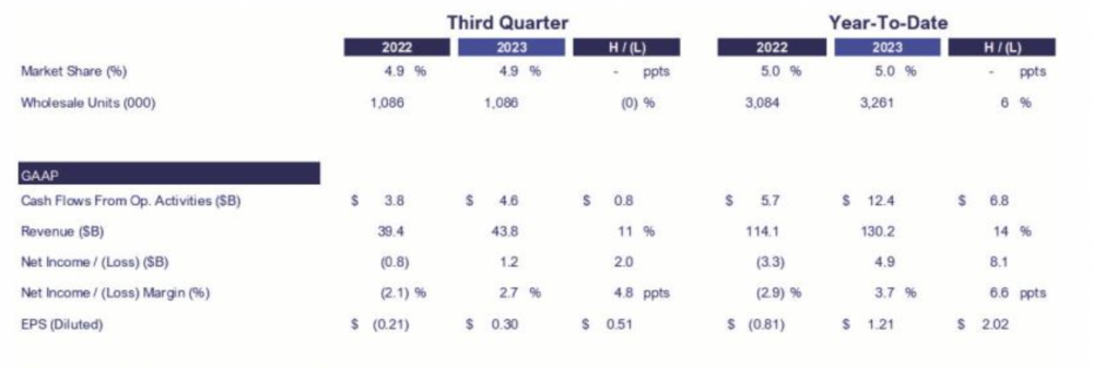 财报显示,福特汽车Q3营收43.8亿美元,同比增长11%,净利润为12亿美元,上年同期亏损8.27亿美元,每股收益为0.39美元,低于市场预期的0.45美元。