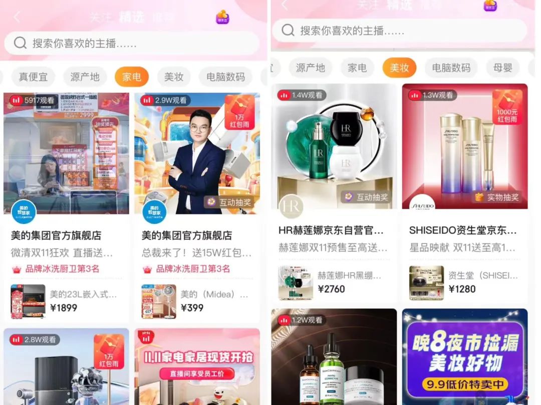 不过,以10月23日京东双十一开启的第一天来看,直播间情况不容乐观。以京东擅长的家电直播来看,当晚十点,以店播为主的美的、海尔、科沃斯、苏泊尔等大牌电器直播间的场观均在3万-5万之间;同样的,美妆直播区,赫莲娜、SK-II、资生堂、雅诗兰黛、科颜氏等大牌美妆直播间的场观也均在5万以下。
