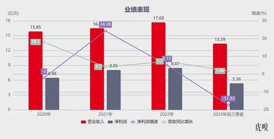 先从公司营收规模看,前三季度,敷尔佳实现营收13.39亿元,同比微增1.86%。如果拉长周期来看,敷尔佳的增长乏力表现得更加明显:2019年,其营收增速接近260%,2020年为18.1%,而自2021年开始则维持在单位数增长。单看今年第三季度,其营收更是同比下滑了约5.5个百分点。