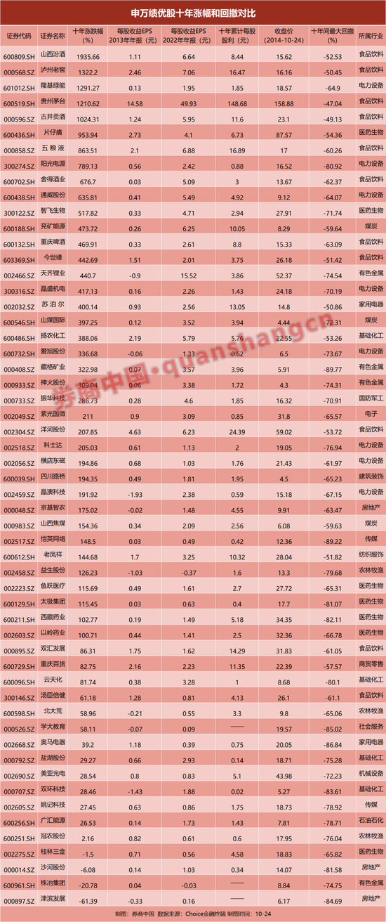 拉长10年时间来看,绩优股的股价与其业绩走势基本一致。在申万绩优股指数中,55家公司上市超过10年的时间,其中38家公司10年涨幅1倍,年化收益超过7%。与此同时,还有22家公司10年涨幅超过3倍,年化收益超过15%,业绩提升是绩优股走强的主要支撑。但这些公司的最大回撤均接近或者超过50%。
