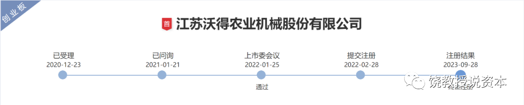 2023年10月25日,江苏沃得农业机械股份有限公司创业板IPO被宣布终止注册,沃得是国内联合收割机龙头,2021年市占率超2/3,2022年销售收入112亿,归母净利润15亿。