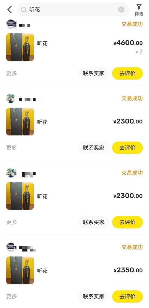 当记者问及产品真伪时,该人士强调,听花名气不够,没有假的。他向记者展示了一张最近3个月的成交记录,图中的成交价从2350元降到了2300元,两位买家合共购买了5瓶听花酒,“(他们)第一瓶都是京东5860元买的”。